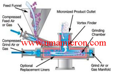 Jet micronization is used to mill particles below 5 microns. Particle to particle impact facilitated by air flow allows for producing particles less than 5 microns in size.